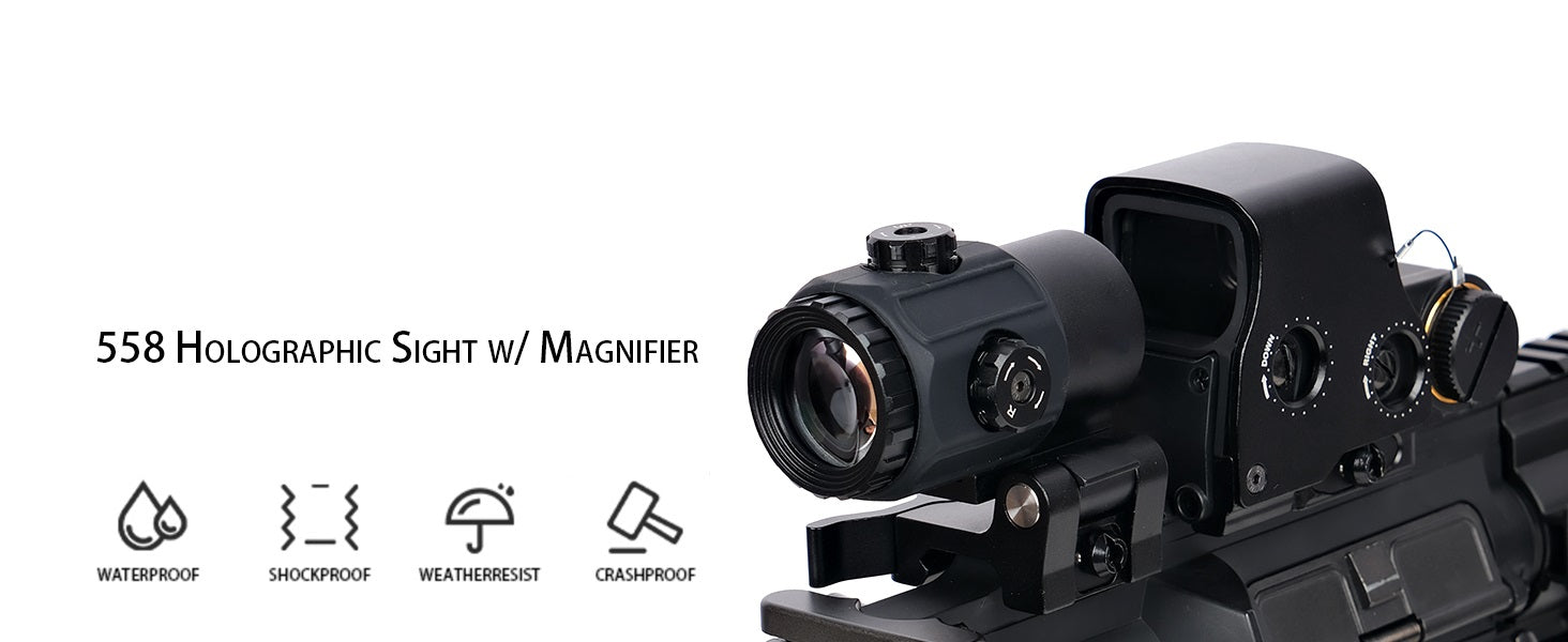 - 558 Holographic Red/Green Dot Sight: 558 has 10 levels of brightness adjustment and uses a quick release base for your quick installation and removal.