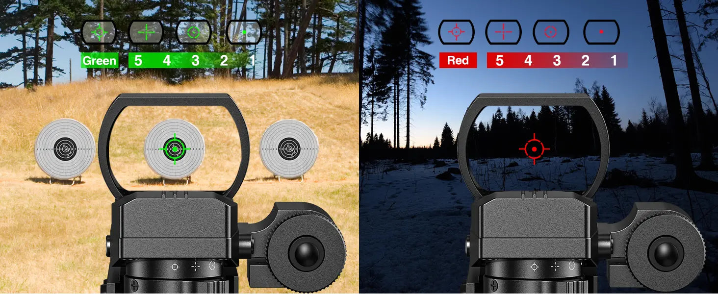 - Versatile Reticle Options: The RSL-88 reflex sight offers 4 reticle modes and 2 color options (red/green), each with 5 brightness levels, ensuring optimal visibility in various lighting conditions