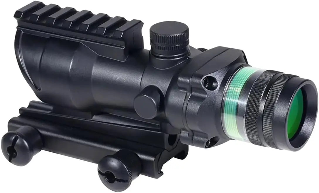 - This 4X32mm scope comes with a real green fiber optic sight,enabling quick target acquisition. Its illuminated etched reticle functions without batteries,Making steady performance. The 32mm objective lens aids in gathering light for clear visuals in Multiple lighting.